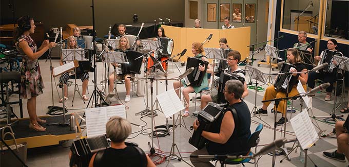 Hans Günther Kölz hat das Akkordeonorchester eingeladen, für ihn das neu komponierte Stück “My Switzerland” in den Bauer Tonstudios in Ludwigsburg aufzunehmen. Am 15. Juli 2023 war es soweit: das Orchester hatte zusammen mit den Tonstudio-Mitarbeitern einen ganzen Tag für die Aufnahmen reserviert. Trotz Hitze blieben alle sehr konzentriert dabei, so dass wir sehr zufrieden waren. Die Aufnahmen sind mittlerweile von Hans-Günther Kölz auf Spotify veröffentlicht – und wir freuen uns riesig über das tolle Ergebnis!