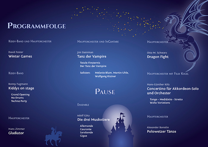 Wie immer startete die Kiddyband – diesmal gemeinsam mit dem Hauptorchester mit dem Olympiasong Winter Games. Den Tanz der Vampire aus dem gleichnamigen Musical führte das Orchester gemeinsam mit dem Neubronner Chor InCantare auf. Unser Ensemble, das sich aus ambitionierten jugendlichen Spielern zusammensetzt, nahm das Publikum mit in die Vergangenheit zu den drei Musketieren. Neben Dragon Fight, das auf einer alten Sage über den Kampf eines Riesen mit einem bösartigen Drachen basiert, war das Concertino für Akkordeonsolo und Orchester der Höhepunkt des Konzerts. Dieses Stück von Hans Günther Kölz, einem der bekanntesten Akkordeonorchester-Komponisten, wurde an diesem Abend uraufgeführt. Herr Kölz war natürlich anwesend und gab in einem kurzen Interview einen Einblick in die Entstehungsgeschichte des Concertinos. Das Publikum bedachte Solist, Komponist und Orchester mit tosendem Applaus.